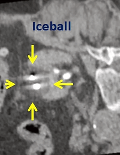 1. The ablation site cannot be seen during the procedure, so it cannot be understood if the tumor is completely destroyed. In contrast, during cryoablation, the ablation area is clearly seen as a dark iceball on CT, MRI and ultrasound, and its size can be adjusted as required.