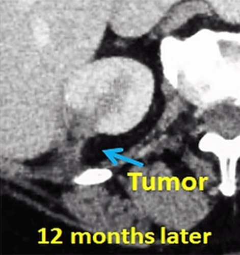 A 62-year-old female patient with cancer in her right kidney (red arrow) undergoes cryoablation with 3 needles. The control CT scans taken at 6 and 12 months after the procedure show progressive shrinkage of the tumor (blue arrow). There was no recurrence during the 4 years follow up.
