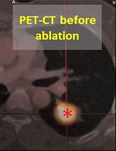 In our patient with a 3 cm tumor (*) in his left lung, microwave ablation was performed using two antennas. The PET-CT taken at 4 months after the procedure shows that the tumor has shrunk markedly and its activity disappeared almost completely.