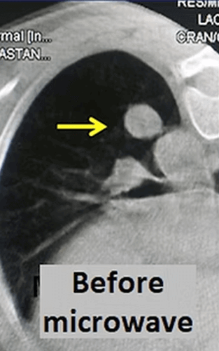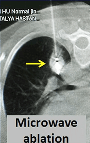 Another ablation method that has become popular in lung cancer in recent years is microwave. Microwave ablation provides a faster and stronger ablation than radiofrequency. However, unlike liver, there is not enough information about the efficiency and complication rates in the lung. In microwave ablation, the microwave antenna is placed in the center of the tumor with CT guidance and the tumor is ablated for 3-10 minutes under general anesthesia or deep sedation. For microwave, tumors that are located in the middle of the lung and less than 3cm in diameter are more suitable.