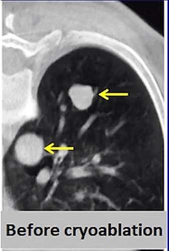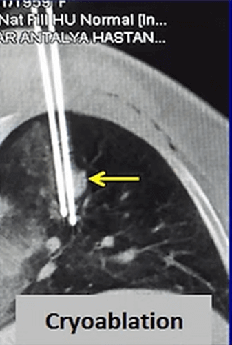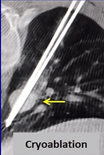 Cryoablation is the newest ablation method in the lung but it is more and more frequently applied for lung cancer. The most important advantages of cryoablation are that it is not painful, can be performed under local anesthesia, can be used in tumors close to the chest wall, the ablation area can be seen as an iceball and larger tumors (> 3cm) can be treated by increasing the number of needles.