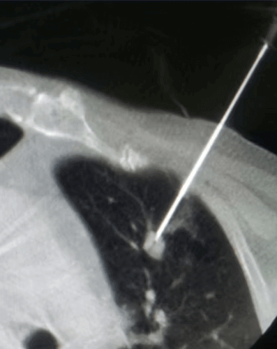 The most common method of percutaneous ablation in lung cancer is radiofrequency. Many studies in the literature have shown that radiofrequency ablation is highly effective and safe. For radiofrequency ablation, the radiofrequency probe is placed in the middle of the tumor under local anesthesia and CT guidance . Then, the patient is given deep sedation or general anesthesia and ablation is performed for 10-15 minutes. After the procedure, the needle is withdrawn and the patient is observed for 3-4 hours. If there are no complications, the patient can be discharged. The most suitable tumors for radiofrequency ablation are those that are located in the middle of the lungs with a diameter of less than 2 cm.