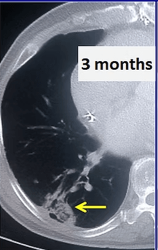 In our patient who had a 4x2cm non small cell lung cancer, cryoablation was performed. After the procedure, the 3 and 6 months control CT images show progressive shrinkage of the tumor.