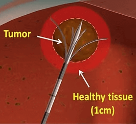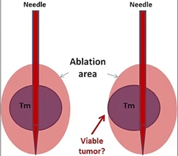 In radiofrequency or microwave ablation, the probe should be in the middle of the tumor. Otherwise, the remaining live tumor can grow again (recurrence).